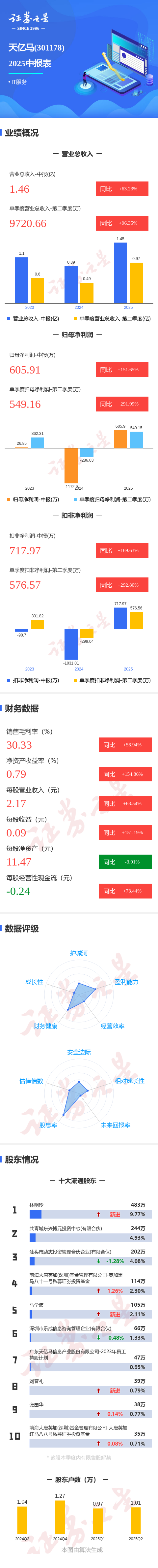 证券之星消息,天亿马2025年中报显示,公司主营收入1.46亿元,同比上升63.24%;归母净利润605.91万元,同比上升151.66%;扣非净利润717.97万元,同比上升169.64%;其中2025年第二季度,公司单季度主营收入9720.66万元,同比上升96.35%;单季度归母净利润549.16万元,同比上升291.99%;单季度扣非净利润576.57万元,同比上升292.81%;负债率45.91%,投资收益-32.65万元,财务费用490.42万元,毛利率30.33%。